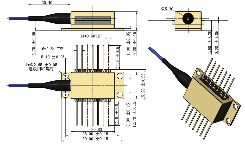 The SWLD series laser diodes cover customer selection of large wavelengths from 1260nm to 1650nm which are fabricated in a hermetically sealed 14-pin butterfly package.The laser diodescontains thermoelectric cooler (TEC), thermistor, monitor photodiode,optical isolator to secure high quality laser performance. The Laser Diodes wavelength is λn±2nm,Output power:≥20mW, Pigtail Type: SM fiber with 900um tight tube, 1.0m, FC/APC connector. Our laser products are Telcordia GR-468 qualified, and in compliance with RoHS directives.