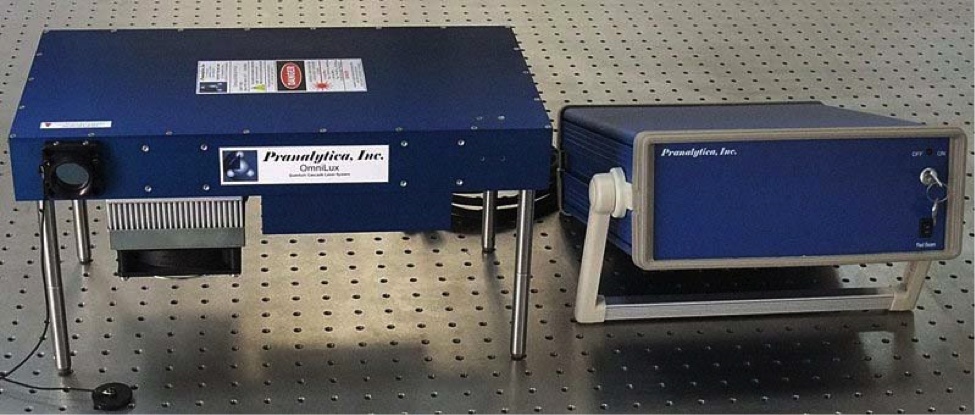 针对光谱学应用Pranalytica提供可大范围调谐的系统。其Omnilux平台集成了四个外腔激光器覆盖6-10μm的整个波谱范围,可提供超过100mW的平均功率。